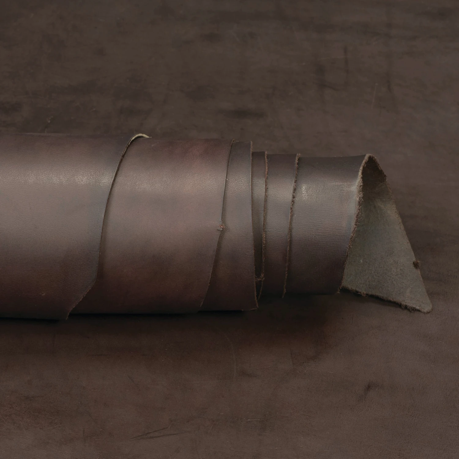 Our team worked diligently with our friends at Chahin Tannery to get this English bridle leather just right. Slowly veg tanned, stuffed with just the right amount of waxes, greases and tallows and drum dyed for depth of color, this leather elevates any project. One look at this leather and you’ll be inspired to create everything from personal accessories like belts and bags to pet products. It has a slight sheen, but feel free to add a top coat for an even richer, high shine finish. This leather will take a stamp, but it will not mould due to the oil content. The flesh side is very nice, giving all sides of your project a finished, professional look. Explore our complete selection of popular colors and cuts to choose what’s right for your next project.