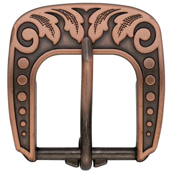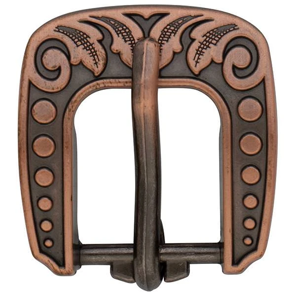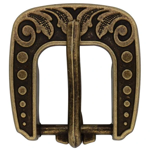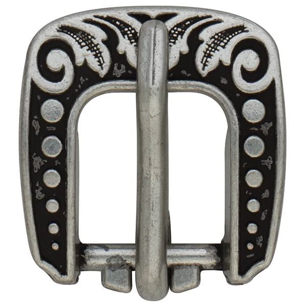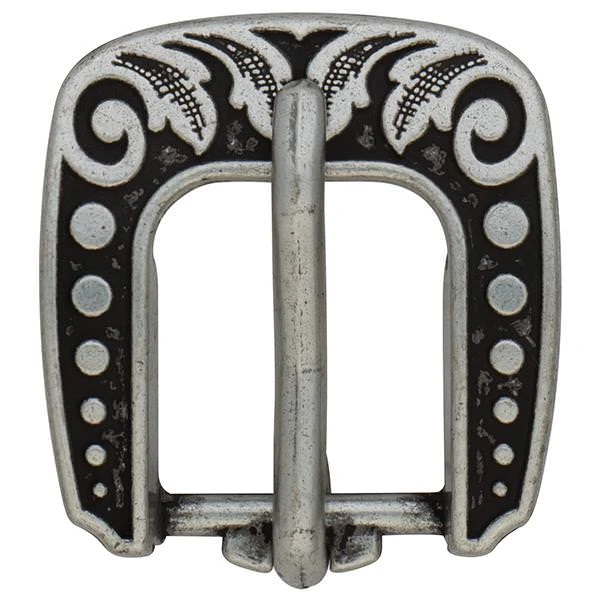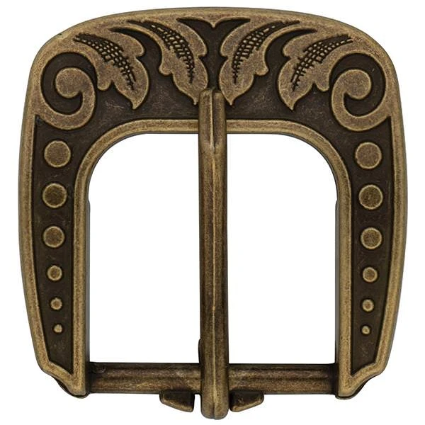 - Vintage-style heel buckle is engraved with a versatile floral design that looks great on a wide range of leather projects