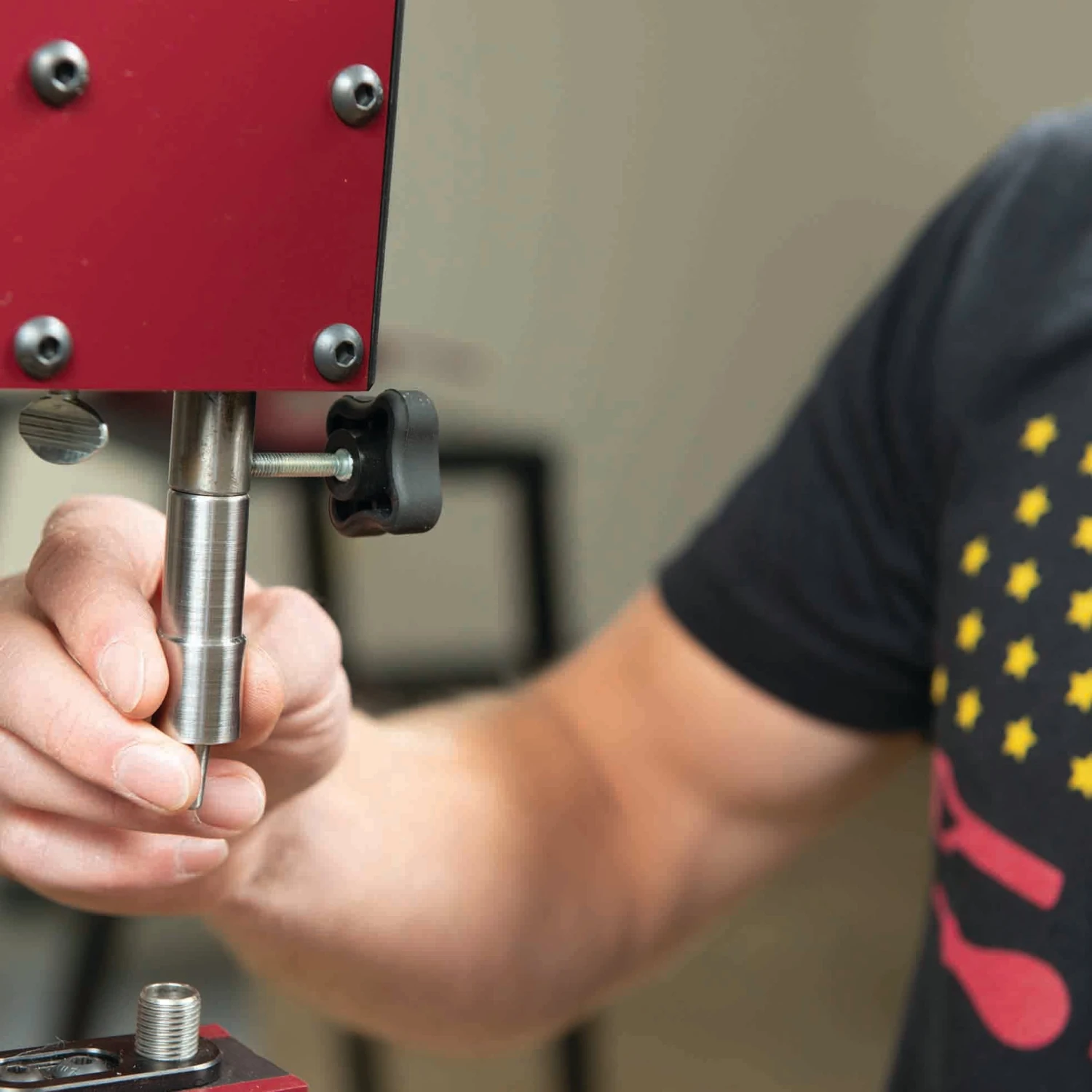- Easy installation of automatic feed riveter attachment by simply sliding on machine and tightening down thumb screw